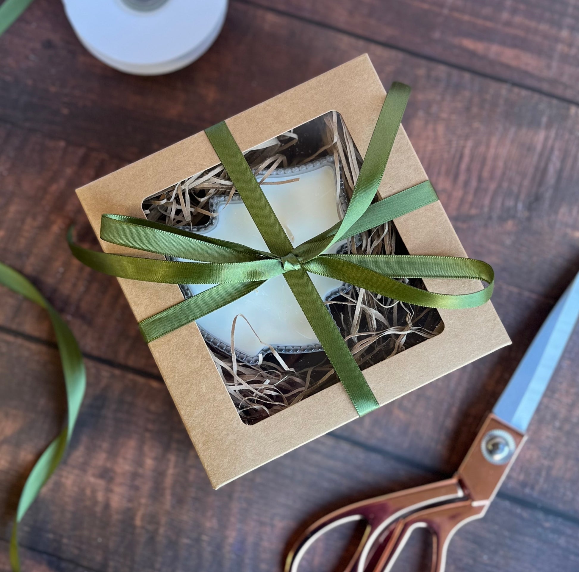 This candle comes in a white Christmas tree shaped glass container and arrives boxed and ready to gift