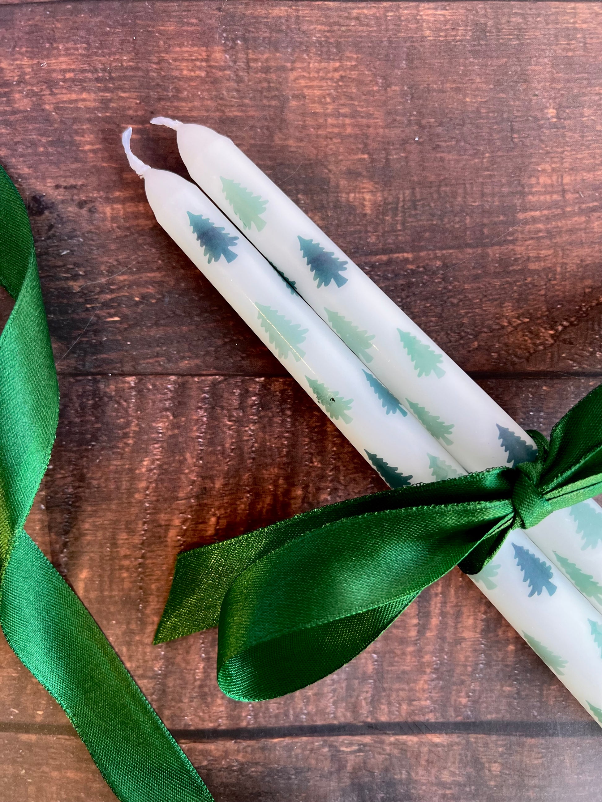 Each candle in this pair is delicately patterned with little green fir trees — a simple, rustic design that captures the quiet charm of a winter forest.