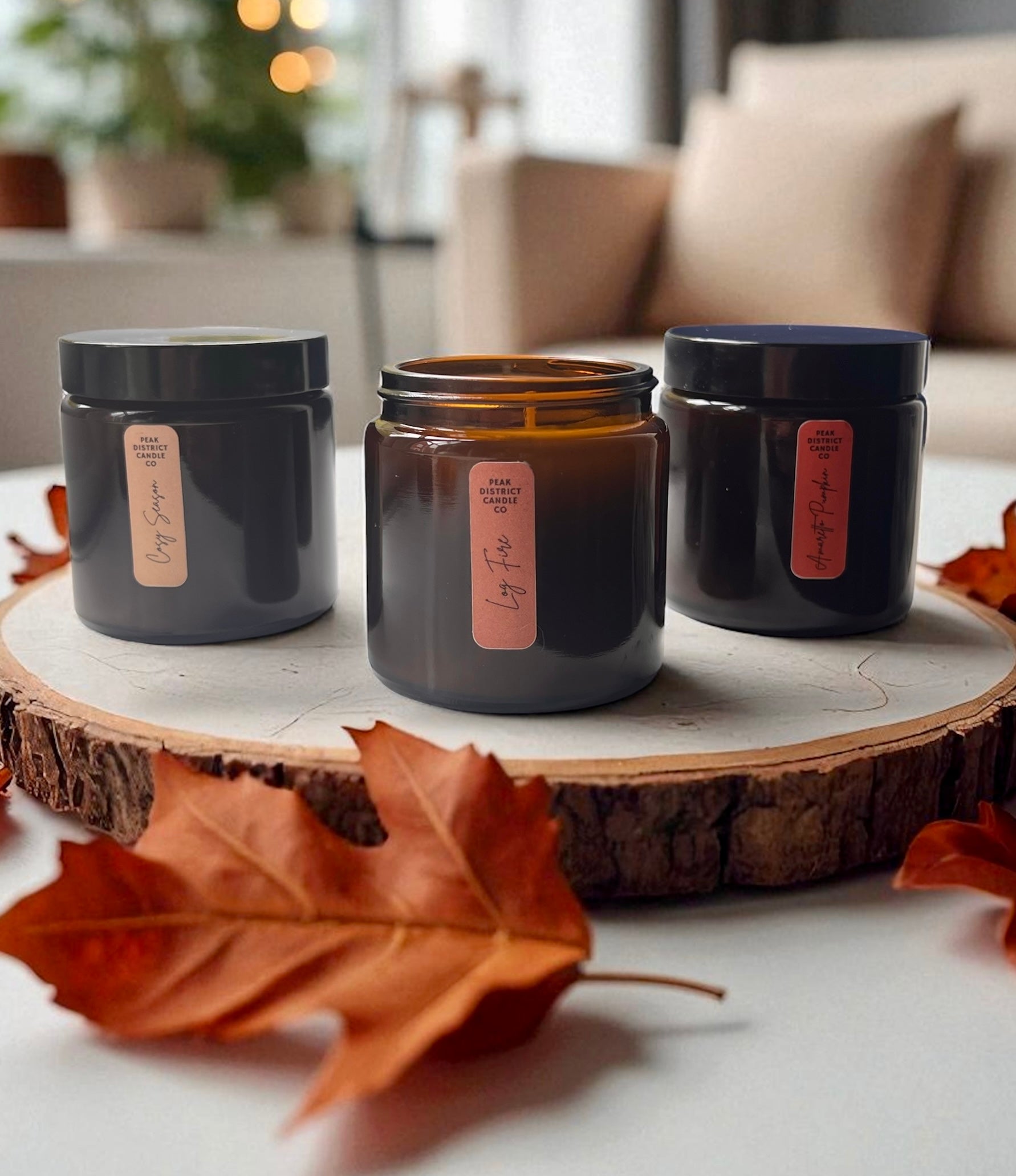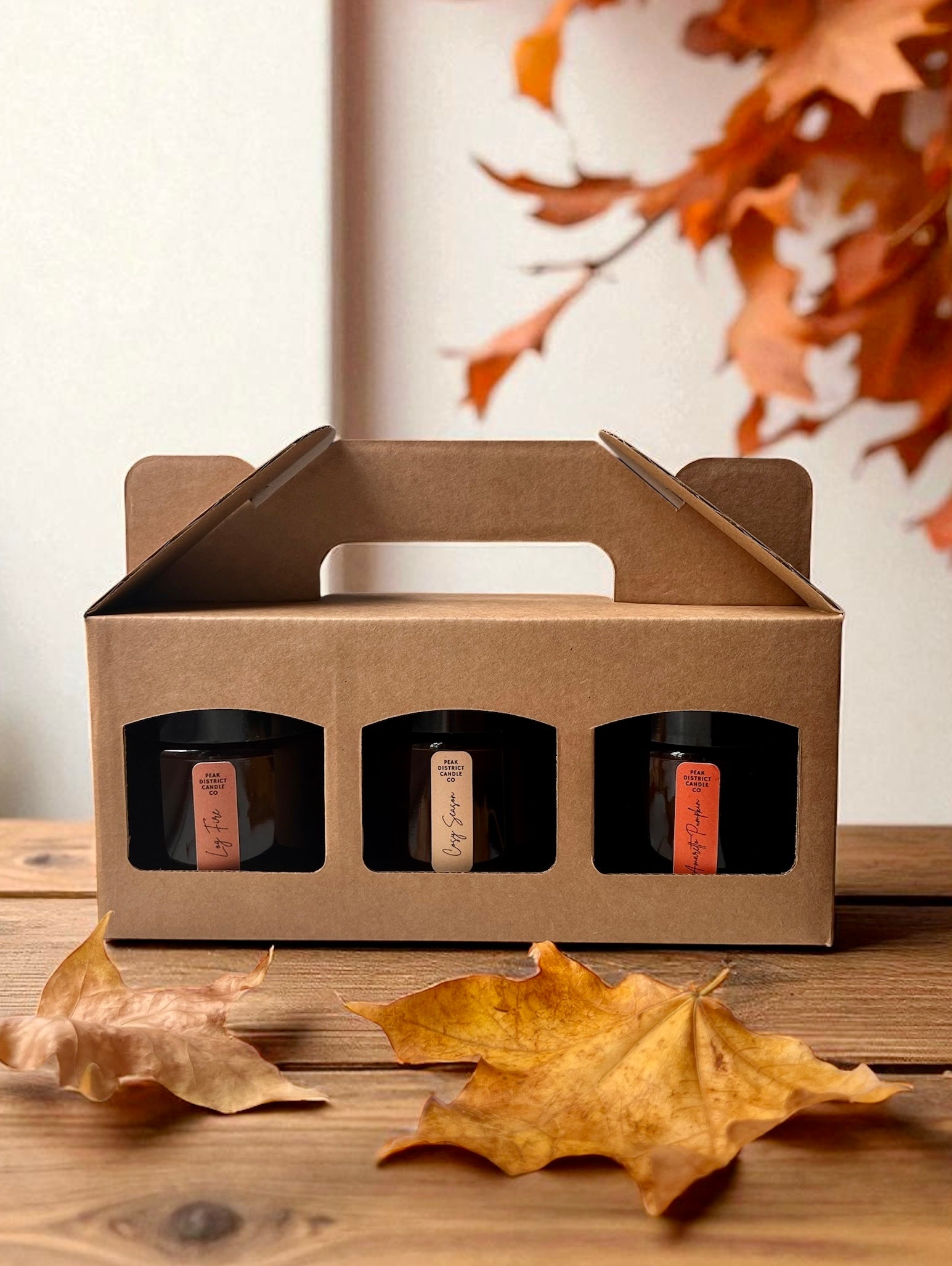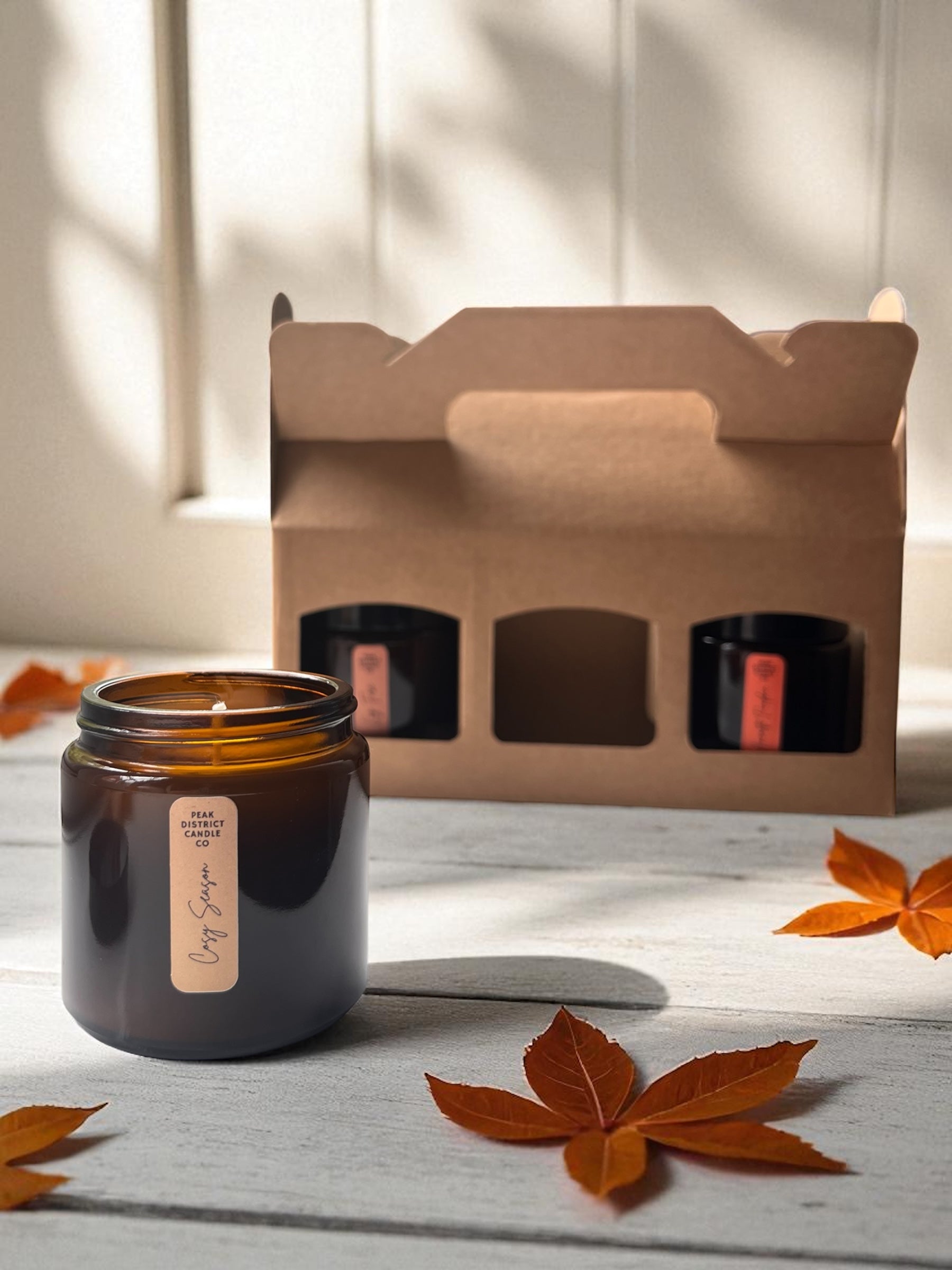 “Let’s Get Cosy” Gift Set – Trio of Autumn Candles— a beautifully packaged set of hand-poured soy candles, each nestled in amber glass jars and presented in a Kraft gift box.